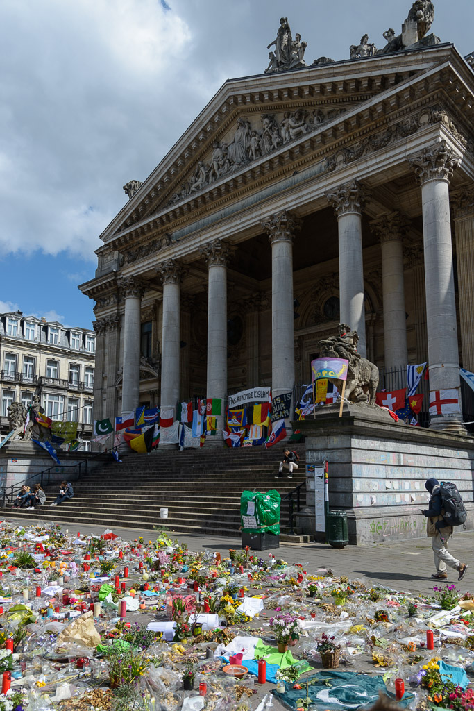 The Place de la Bourse. Today, the Place de la Bourse is commonly used for public celebrations and demonstrations. This one memoralizes those killed or injured in the Brussels bombings on March 22, 2016.