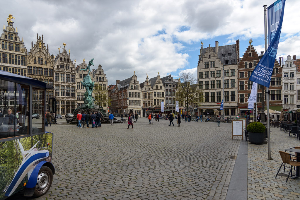 Antwerp's main square, the Grote Markt. The buildings across the square beyond the fountain are guild halls.