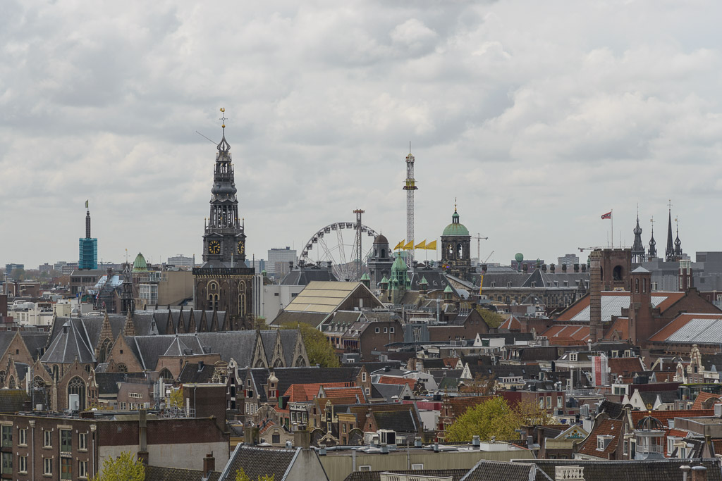 The ferris wheel is part of the carnival at Dam Square. The spire is the Oude Kerk (Old Church)