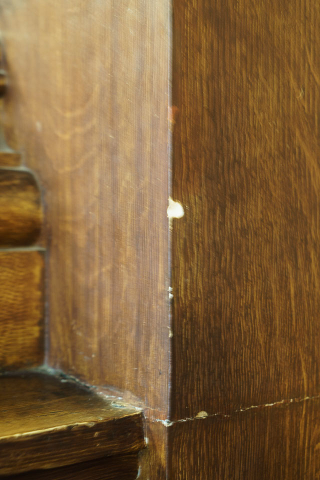 Common during this period in Porto, the 'woodwork' in many buildings is actually finely painted plaster. This chip in the corner exposes the plaster beneath the paint.