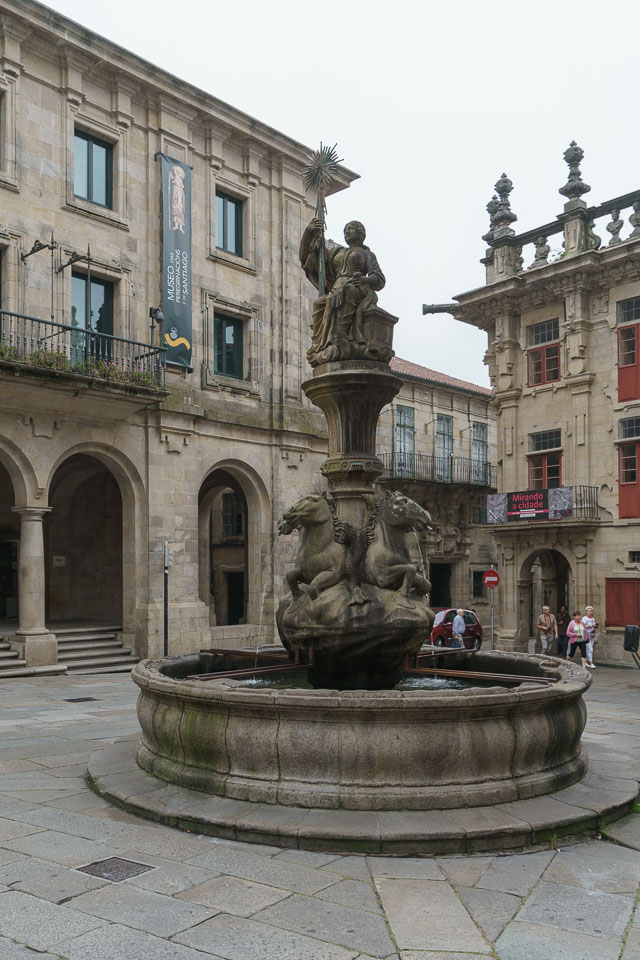 Central to Praza das Praterías (Silversmth's Square) is a fountain with a sculpture of a woman atop the tomb of St. James and holding a star, a symbol of the city.