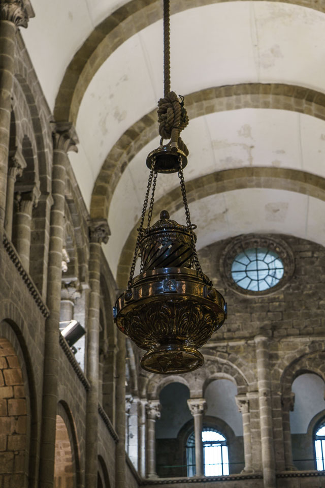 The Botafumeiro (incense burner) at rest. It is used once a month during mass, when it is lit and swung back and forth across the sanctuary.