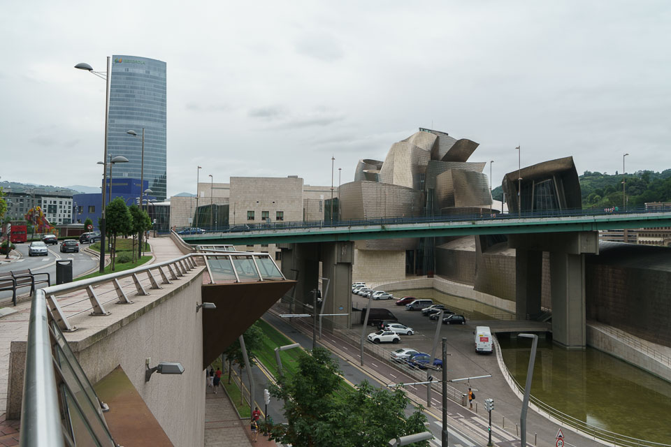 A view of the Guggenheim Museum Bilbao and the Iberdrola Tower, designed by César Pelli