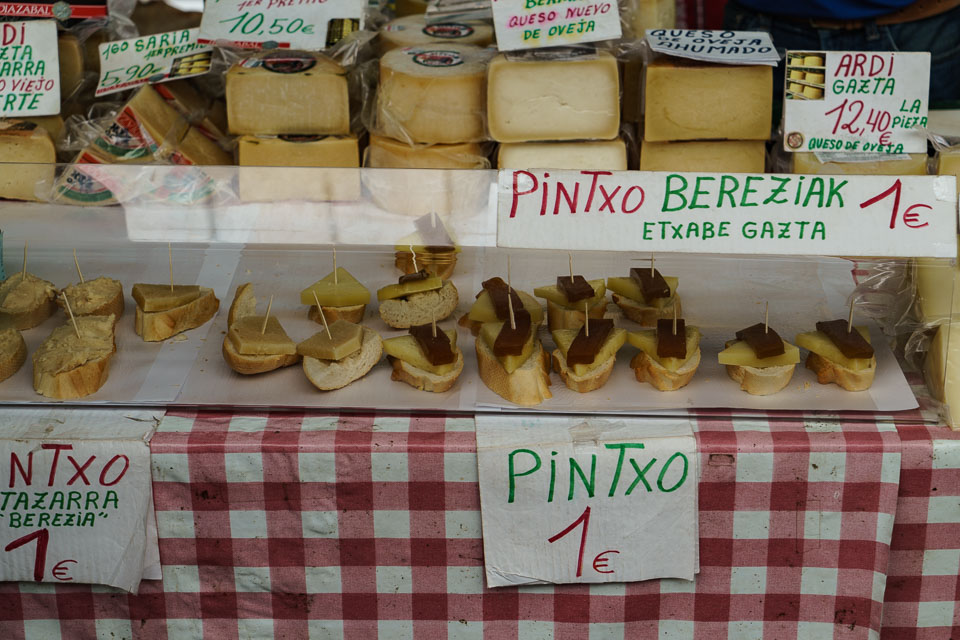 Our pintxo lunch - we selected the pintxo on the right: bread, cheese, and quince