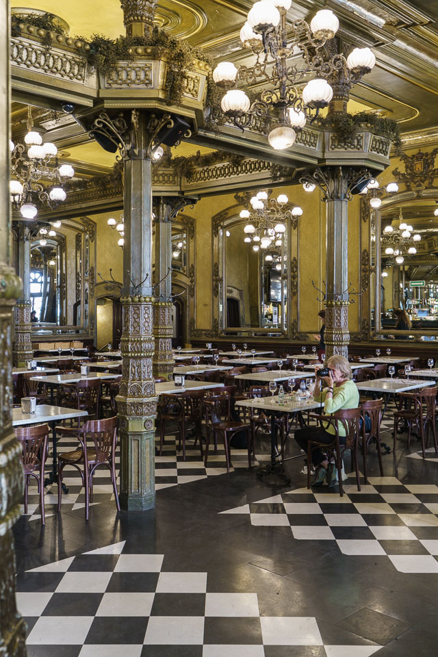 Roxanna inside Cafe Iruña. She is photographing Whit, who is at the bar collecting beverages.