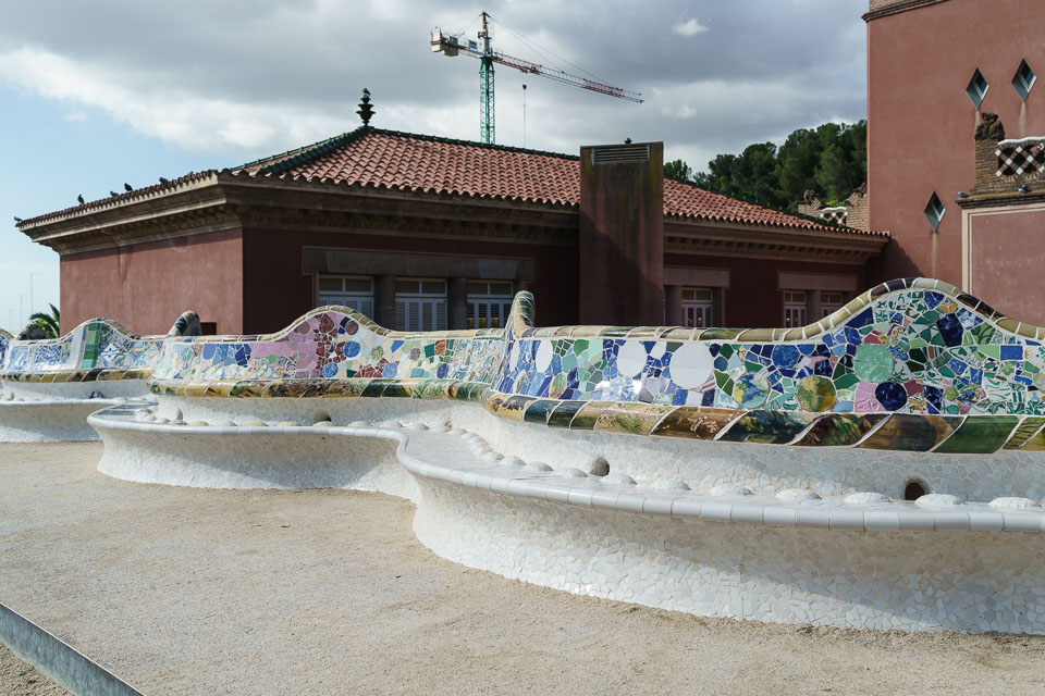 The terrace is bordered by a sinuous bench decorated with trencadis.