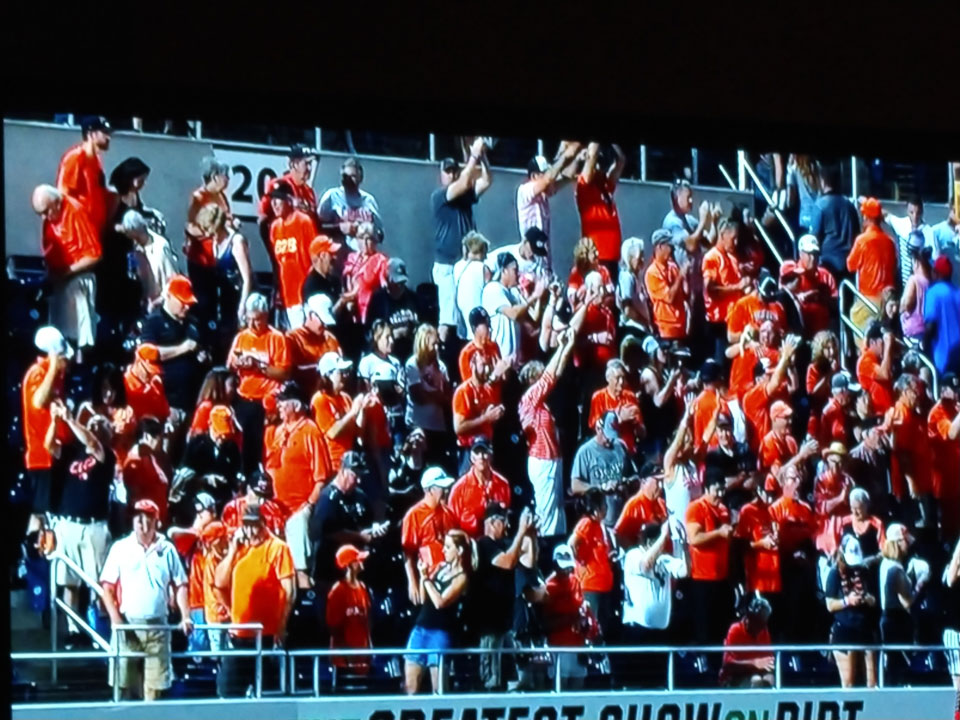 A TV screen capture from Doug's brother Bill during Game 2. Jeff, Kathy, and Doug are near the center of the photo, cheering that the Beavs had gone ahead on a two-run homer in the top of the 9th.
