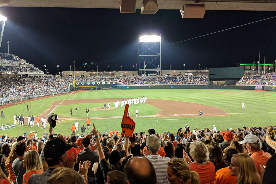 The Beavers celebrating their second win against Mississippi State, taking the Beavs to the Championship Series.