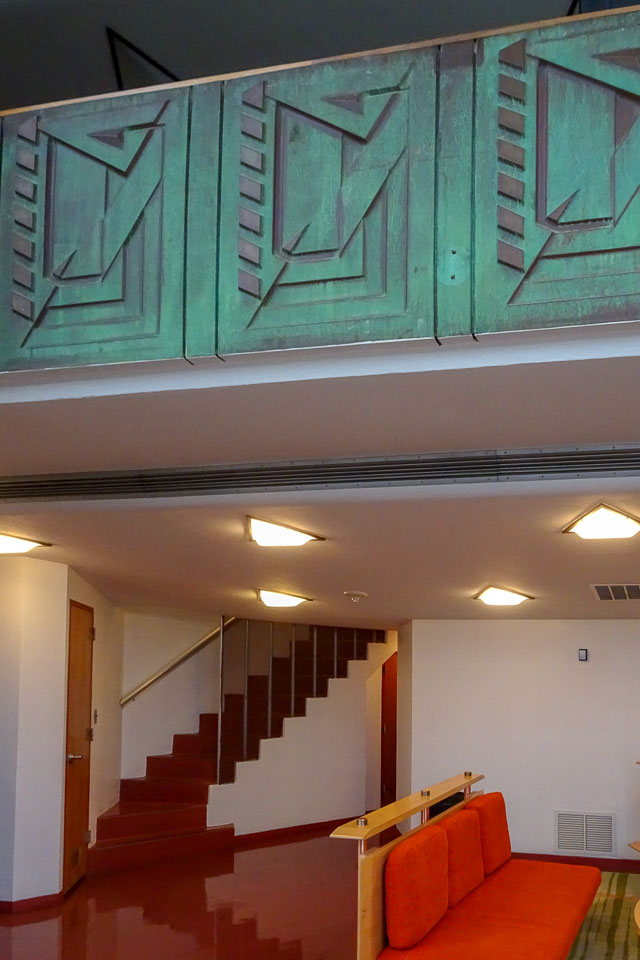 The stairs to the bedroom level. The bedroom is behind the copper-paneled half-wall above.