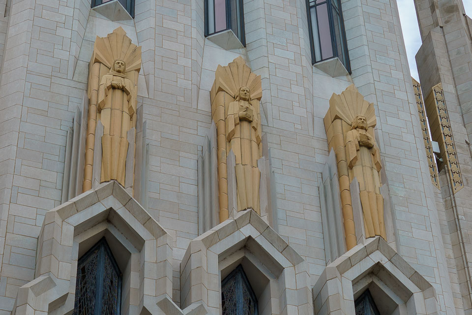 North entrance detail, depicting John and Charles Wesley, cofounders of Methodism, and their mother.