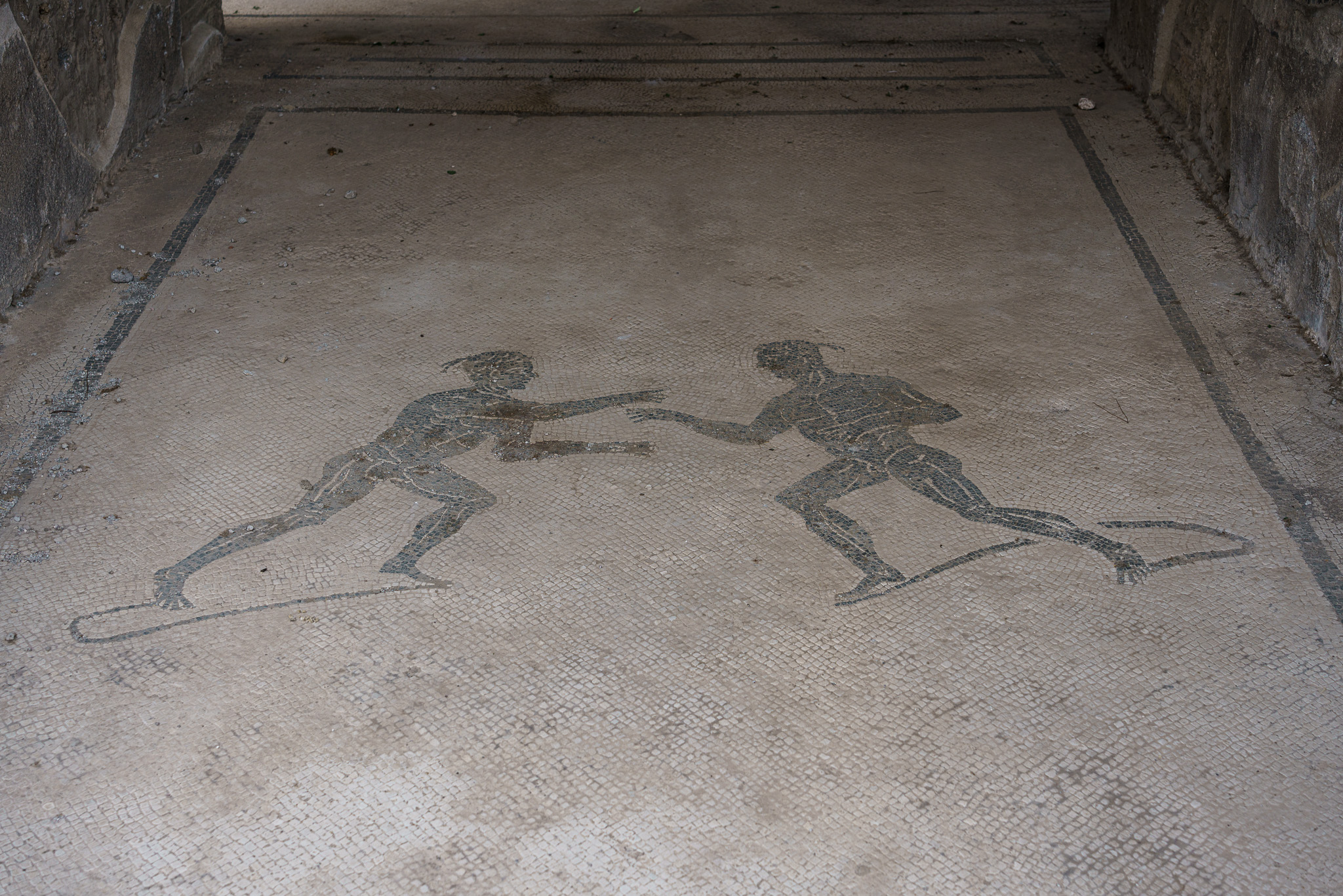 Black and white mosaics were generally not popular among the people who raided the site and thus a number remain. Colored mosaics have mostly been removed.