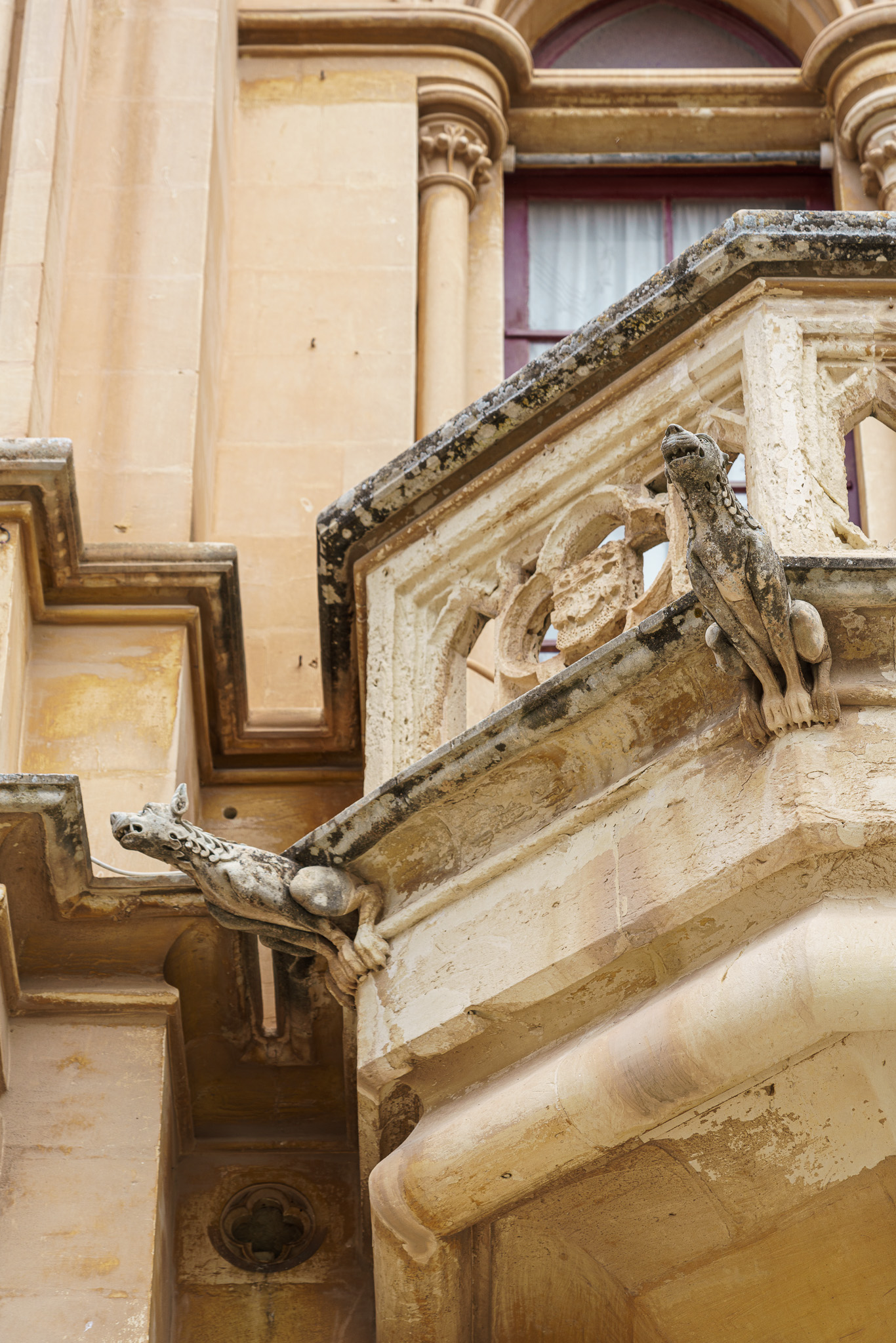 I think that these decorations are 'Grotesques' rather than 'Gargoyles', as they do not appear to me to be water spouts.