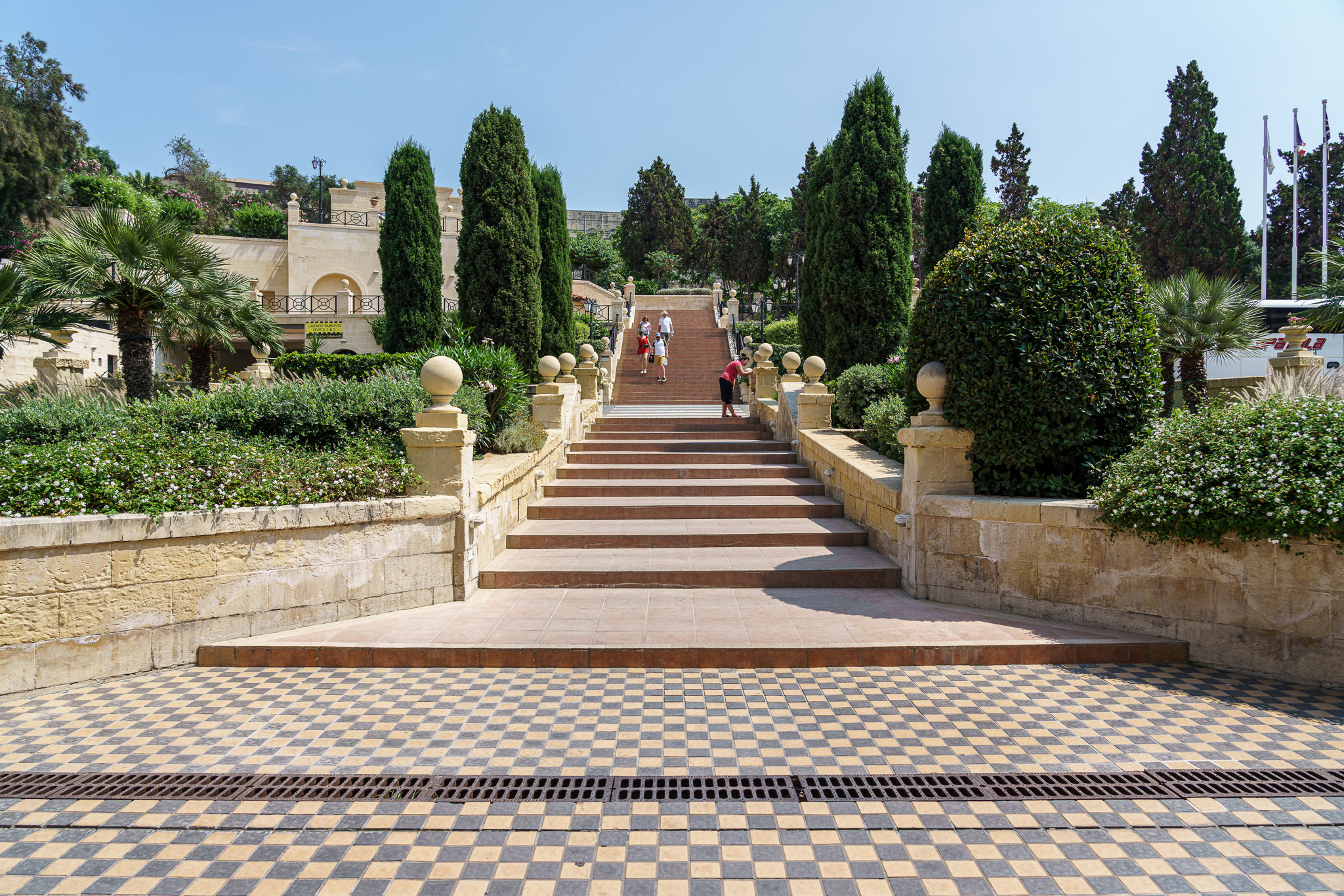 This stairway is coming down from the city to the hotel.