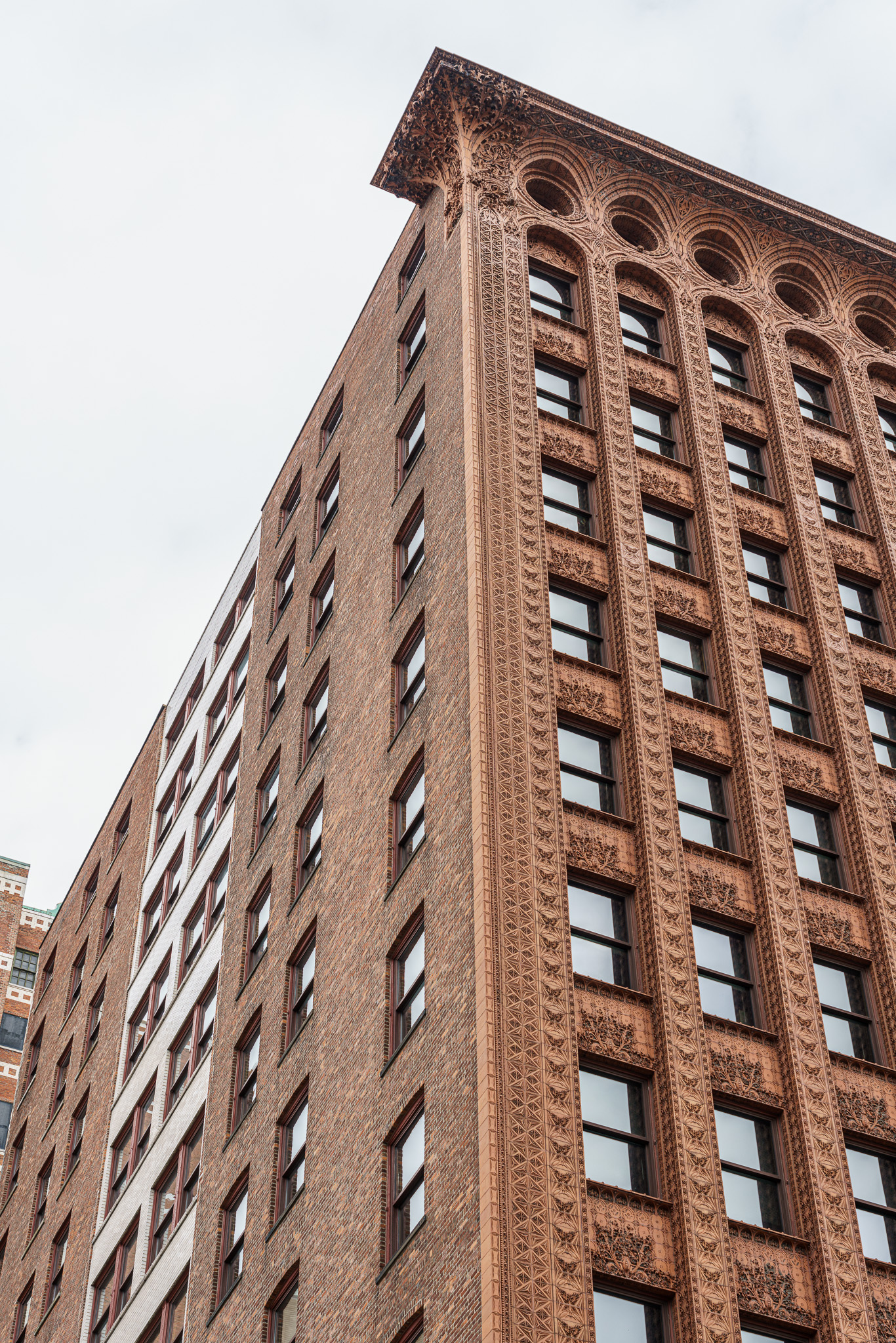 The white wall in the center-rear of the building is where the current owners, the law firm that restored the building, added additional office space. This space was open in the original building, allowing all offices to have windows that could be opened in that time before air conditioning.