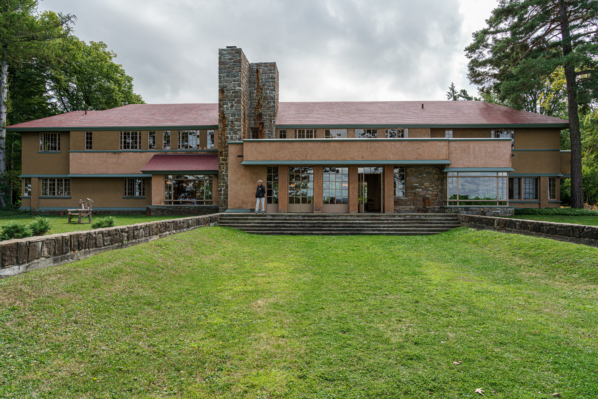 Wright intended this area below the steps and between the stone walls to be filled with water.