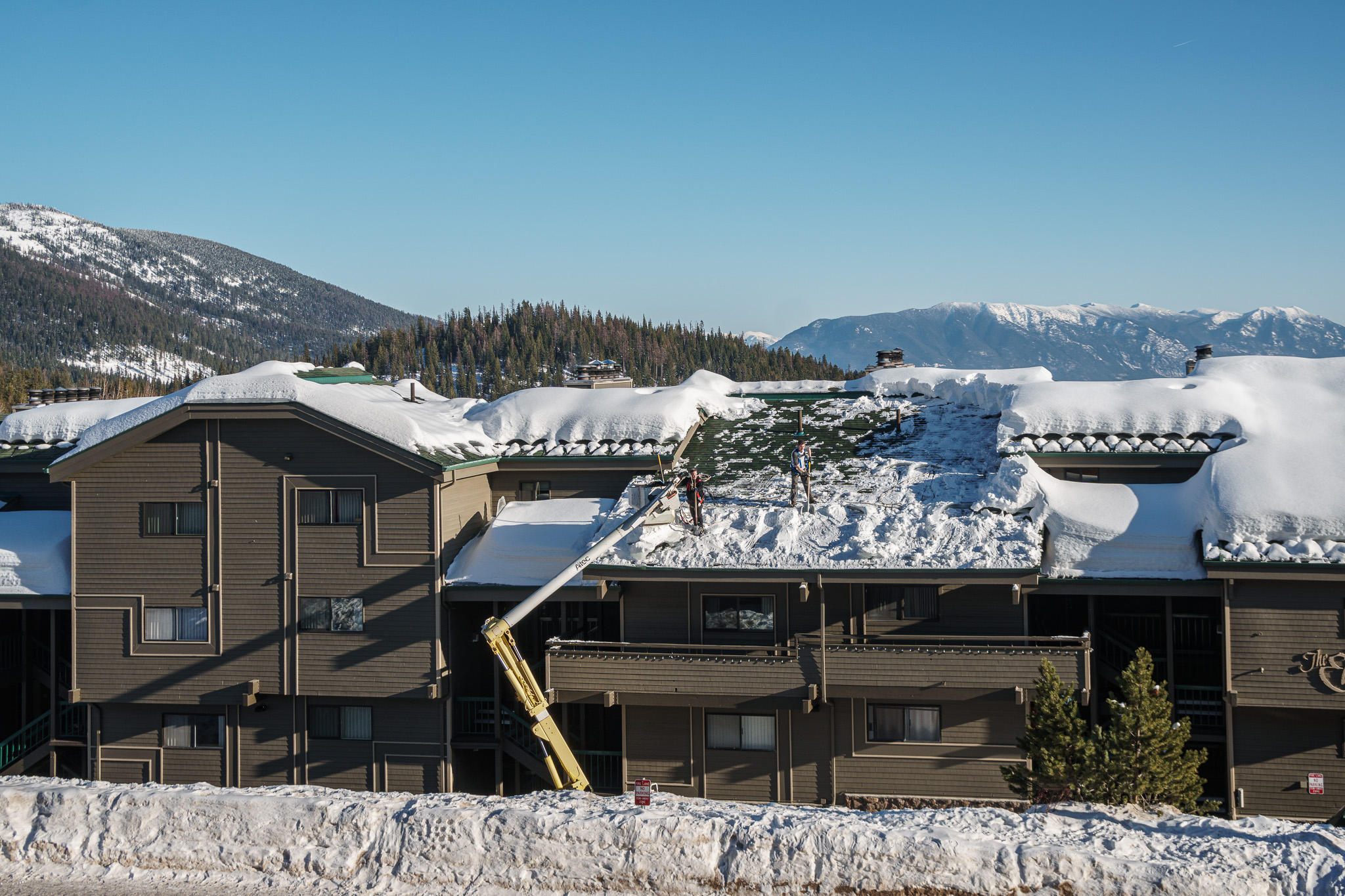 Removing snow from the roof of the condo across from us
