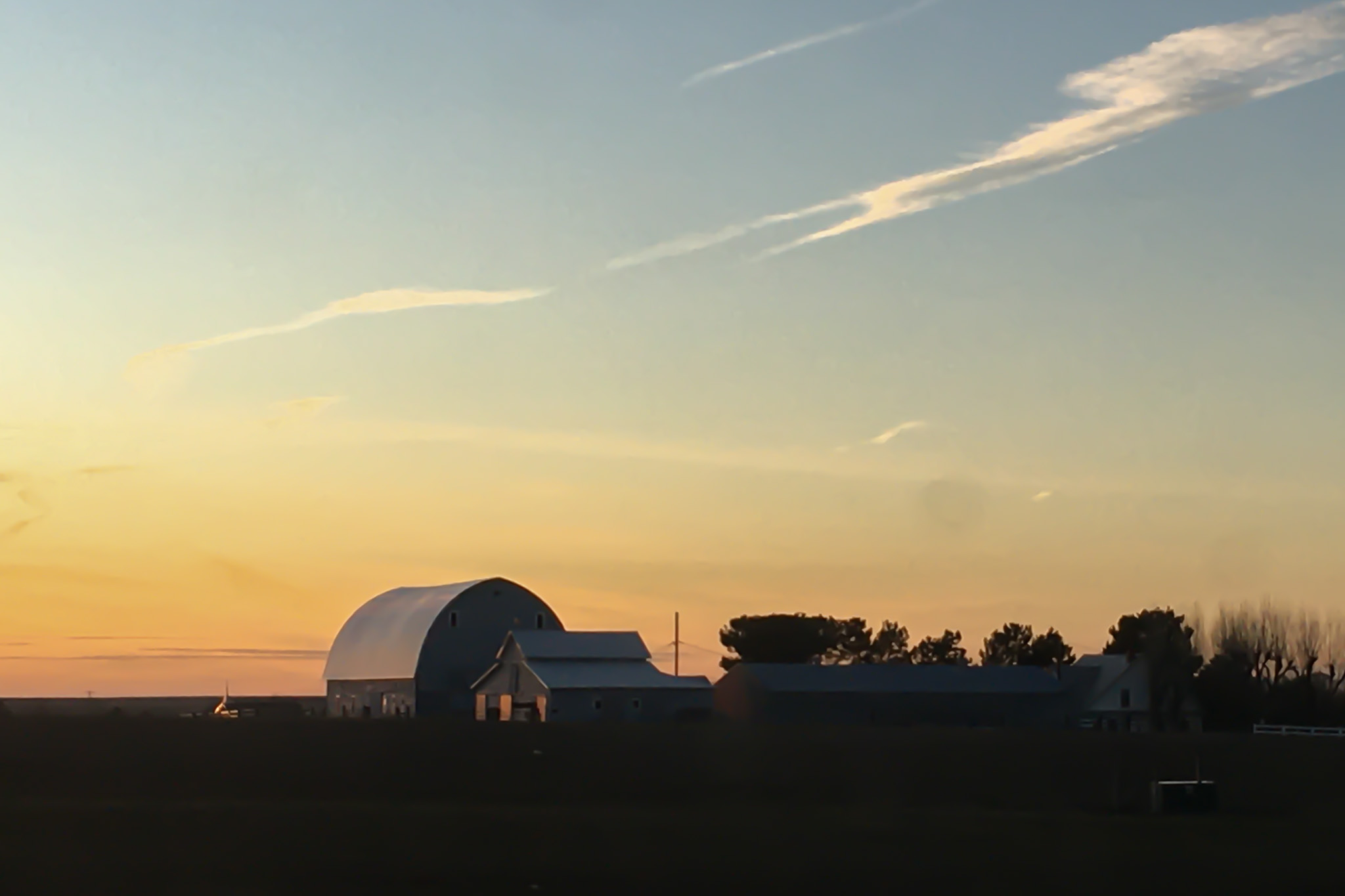 Sun setting behind the farm