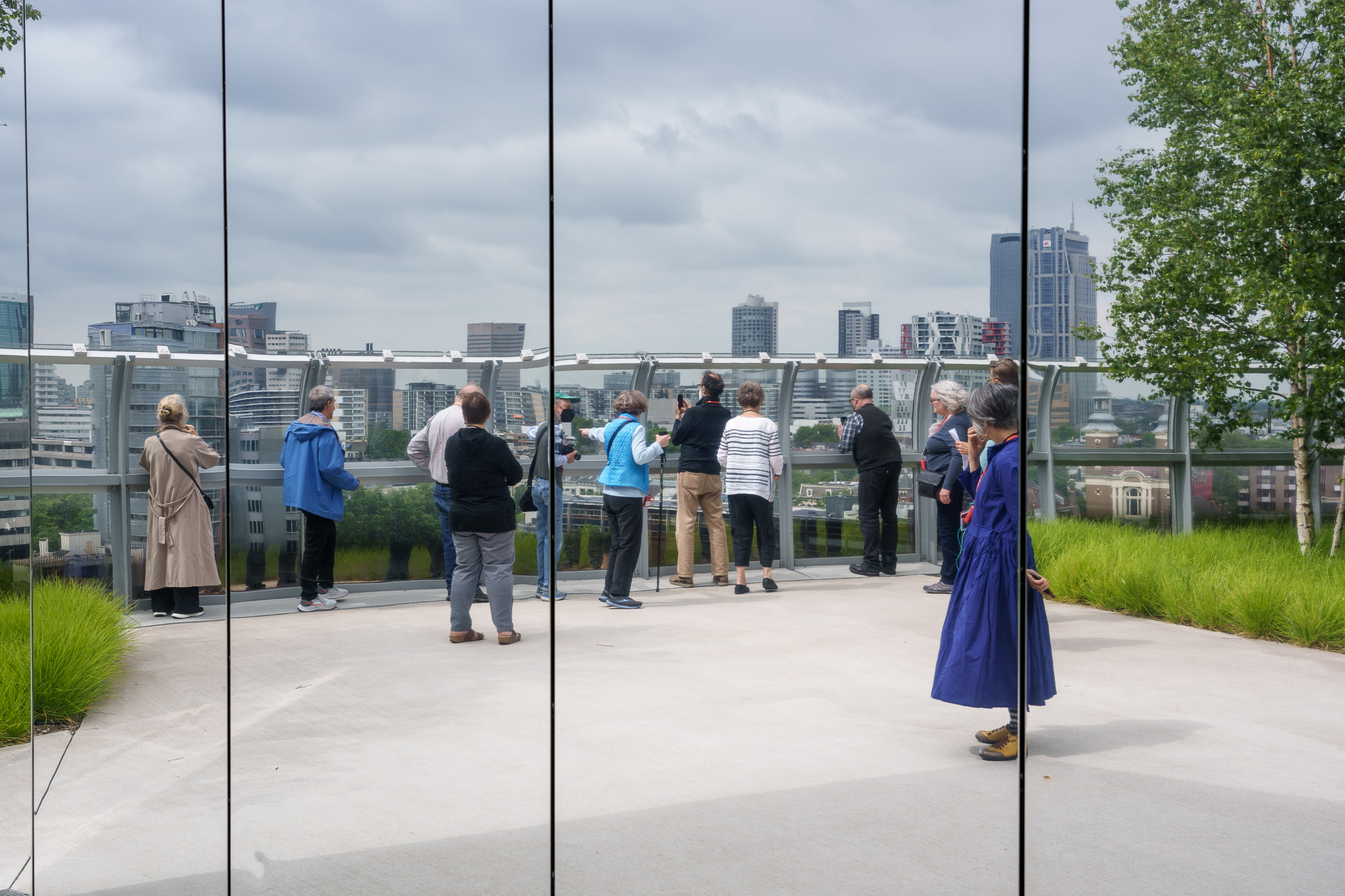 A reflection in 'The Depot' of our tour group viewing the Rotterdam skyline