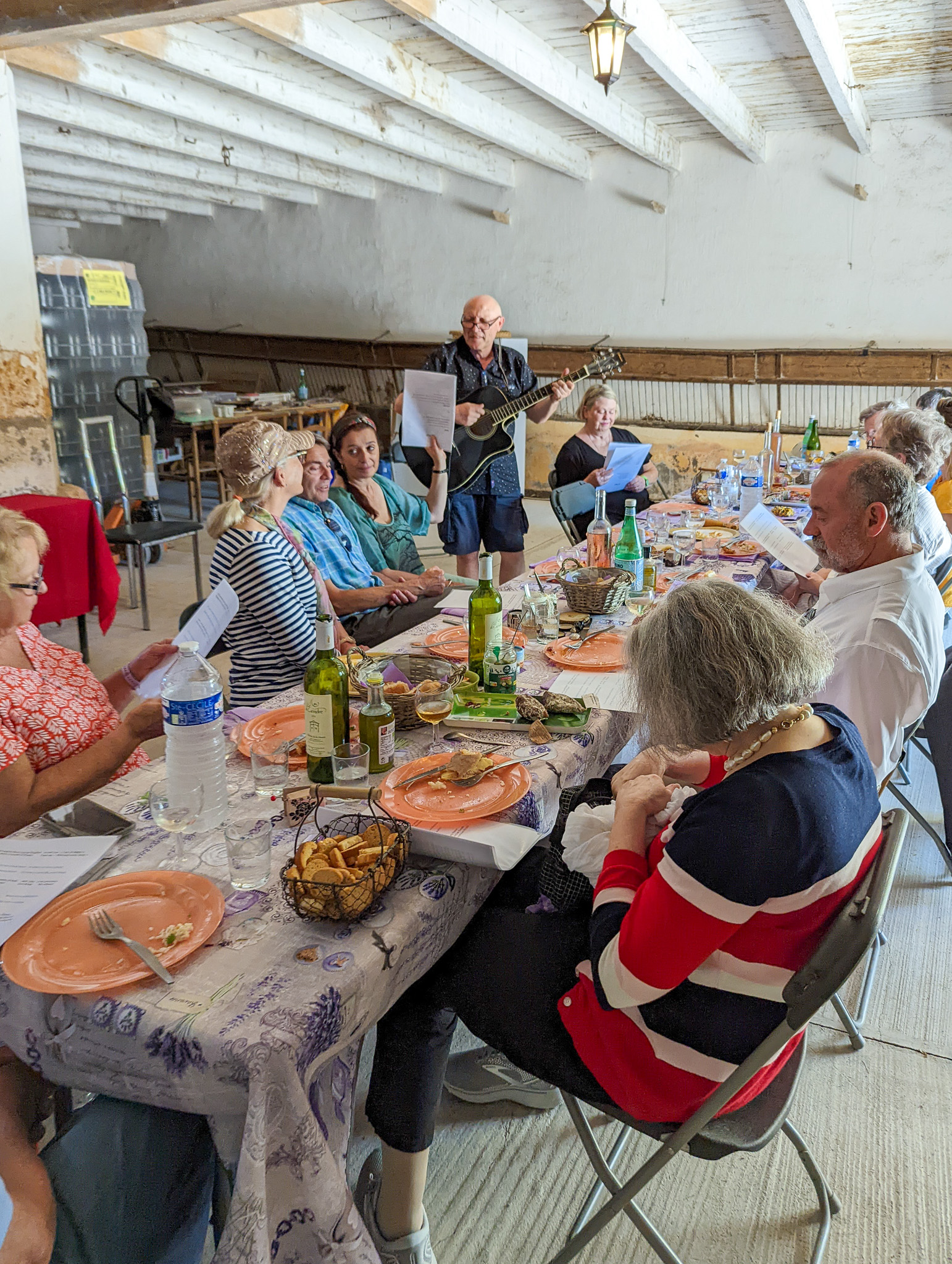Julia's mother Cathy (pronounced 'Cat'-tea') prepared a lovely Provençal picnic dinner, and her father Stéphane entertained us. That is Cathy holding the lyrics for Stéphane.