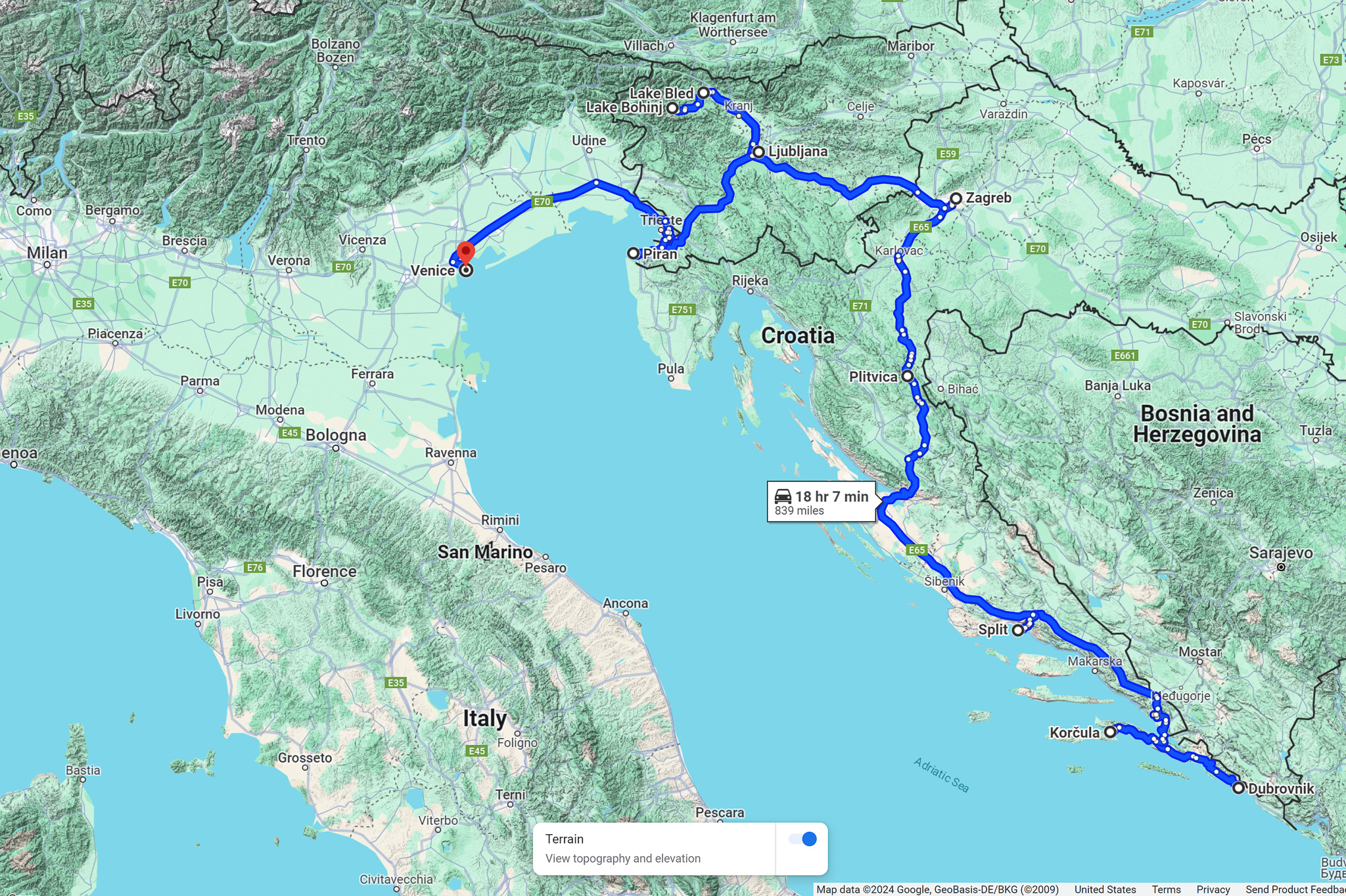 The route of our tour from Dubrovnik to Venice, masterfully planned by Customized Journeys and perfectly executed by Jasmina and Boris. Along Croatia's 1,166 miles of mainland coastline (327 miles between the extreme points), there are more than 1,000 islands.