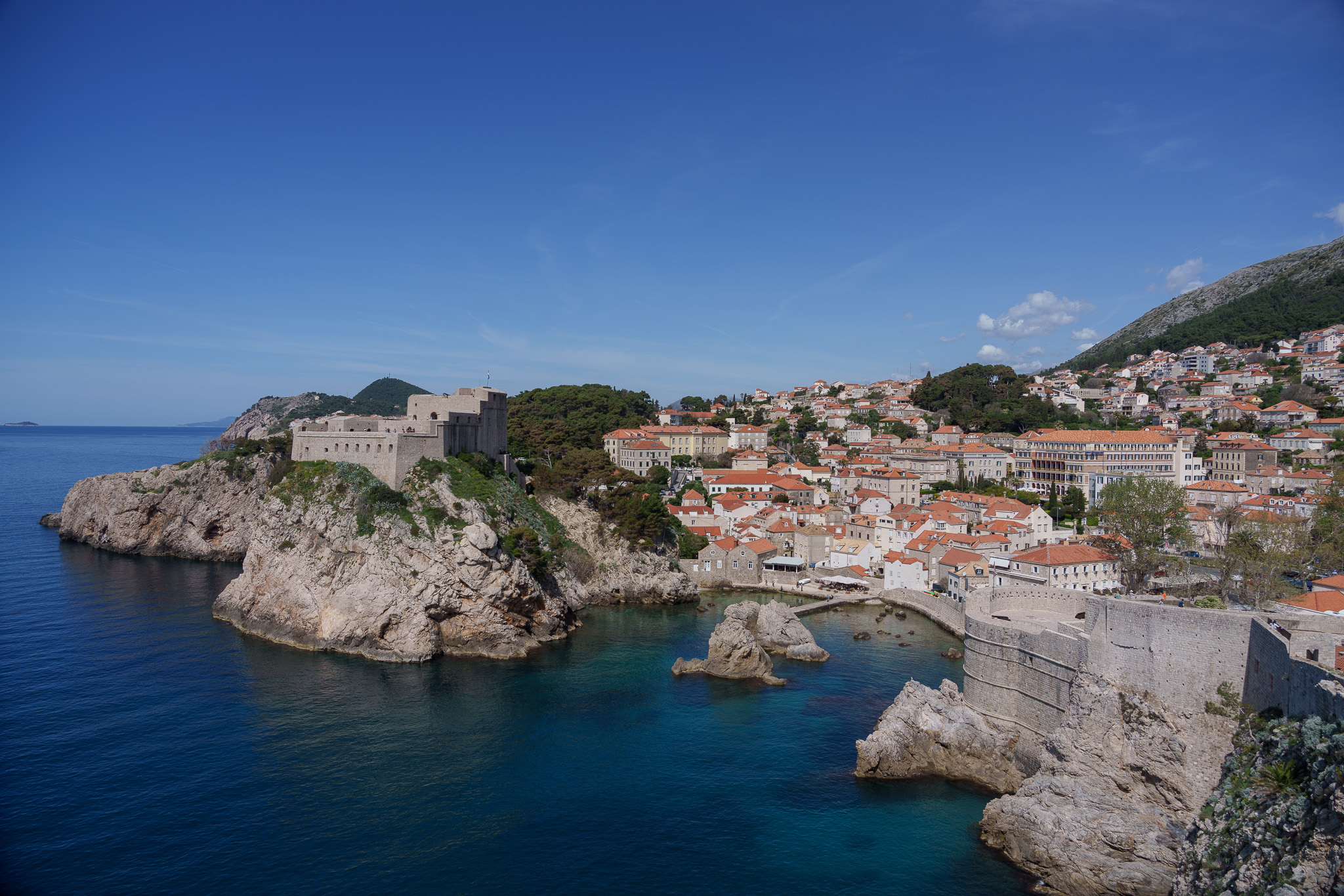 At the top of the hill on the left, and outside the old city walls, is Fort Lovrijenac or St. Lawrence Fortress. It played a key role in protecting Dubrovnik from the Venetians.