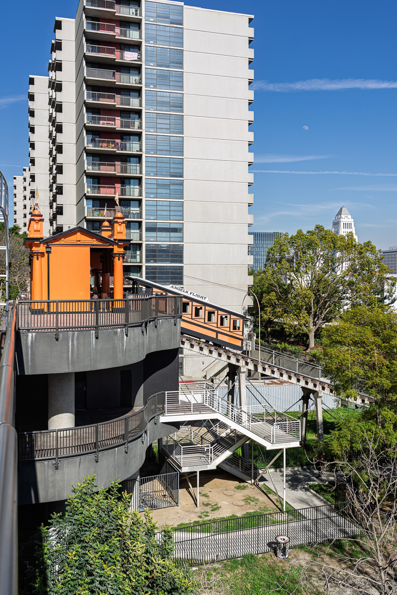 The Angels Flight Railway is used to avoid the climb up and down Bunker Hill.